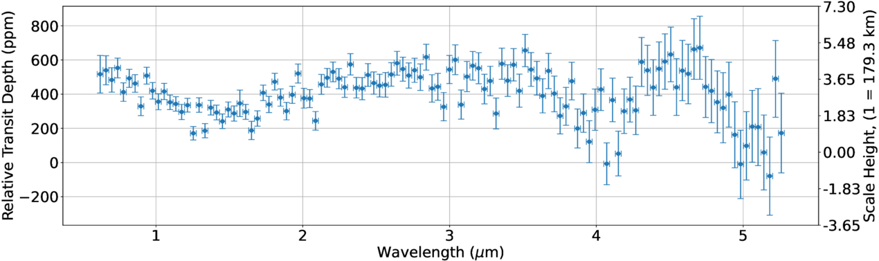 The relative transit depth and scale heights for the optimized Eureka!+fleck transmission spectra. The spectrum shown here is a weighted average of all three transits. Scale heights assume a mean molecular weight of μ = 2.2.