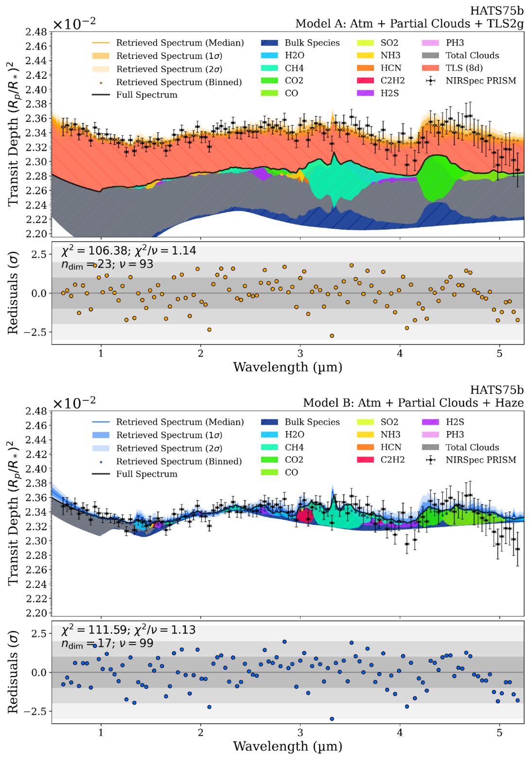 Retrieval fits to the HATS-75 b coadded transmission spectrum for the preferred TLS contamination model (top plot) and preferred haze model (bottom plot). Both plots show the spectral fit (upper panel) and the relative residual (lower panel). The data (black error bars) are compared against the median retrieved transmission spectrum with 1σ and 2σ credibility envelopes. The black model shows the best-fitting planet spectrum simulated without TLS contamination (contribution highlighted in red). Shading below the best-fit atmosphere shows molecular contributions to the spectrum.