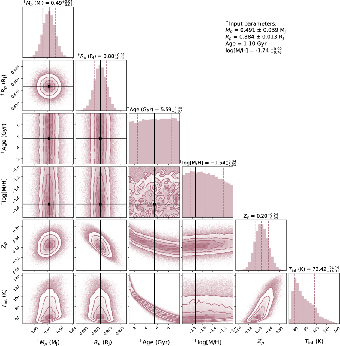 Estimates for bulk metallicity Zp and the intrinsic temperature Tint using measurements of planet mass, radius, atmospheric metallicity, and the system age. The input parameters for the statistical model are marked with a † and listed in the figure.