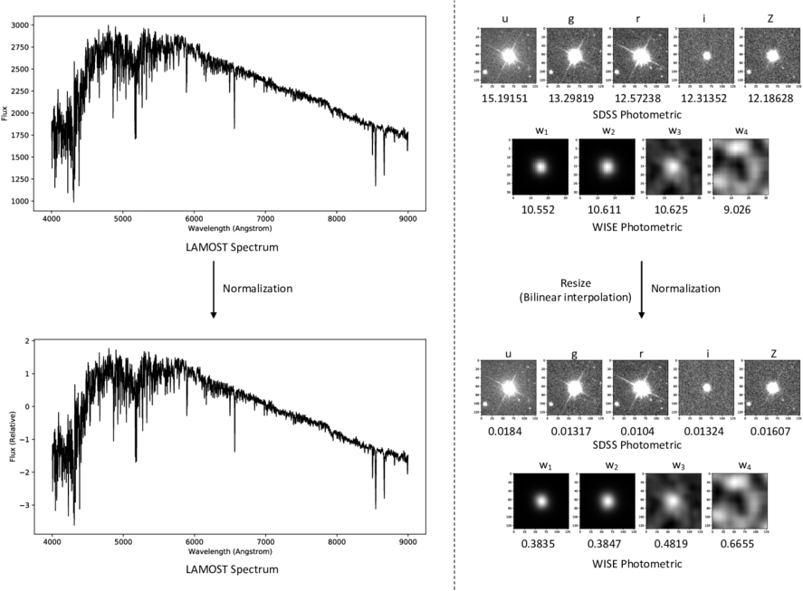 Preprocessing pipeline for spectral and photometric data. Each spectrum is standardized using z-score normalization to ensure uniform scaling (left panel). Photometric data are globally normalized to maintain consistency across modalities (right panel).