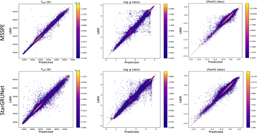 Scatter density maps for the parameters Teff, ﹩\mathrm{log}g﹩, and [Fe/H]. The top row shows the results from the MSSPE model, while the bottom row presents the results from StarGRUNet.