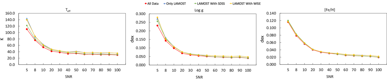 Comparison of the MAE for Teff, ﹩\mathrm{log}g﹩, and [Fe/H] under different data inputs across various SNR intervals. Red dots represent results using all data (LAMOST spectra combined with SDSS and WISE photometric data); blue triangles correspond to results using only LAMOST spectra; green squares denote LAMOST spectra with SDSS photometric data; and orange diamonds indicate LAMOST spectra with WISE photometric data.