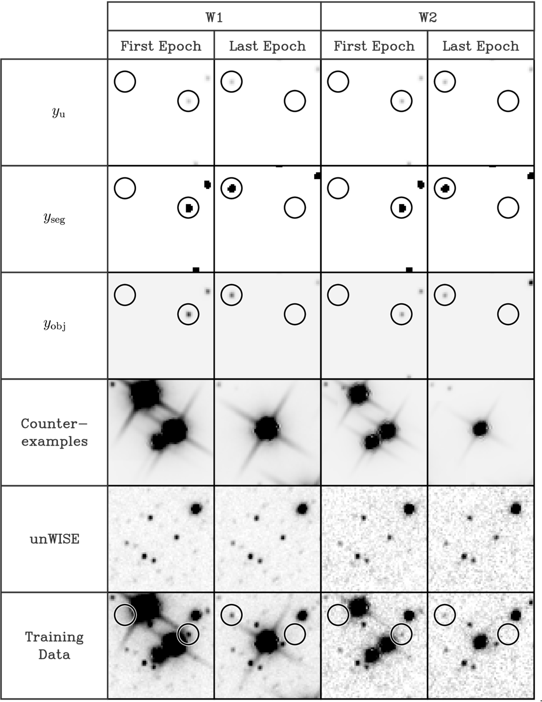 First and last images from an example in our training dataset. SMDET input shown in the Training Data row is equal to unWISE + yobj + Counterexamples. yobj is the reproduction of FFOs in the input and ground truth for SMDET output ﹩{\hat{y}}_{{\rm{obj}}}﹩. yseg is the segmentation of the input and ground truth for SMDET output ﹩{\hat{y}}_{{\rm{seg}}}﹩. yu, which we used to construct yseg and as a parameter in loss calculation, is equivalent to yobj except that each object has total flux = 1 DN. First and last positions of one synthetic FFO are circled. Other objects enter or exit the field of view in the time series and are therefore not present at both epochs. We address this when processing unWISE data by overlapping the fields of view of adjacent time series (Section 2.2).