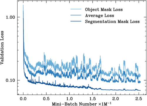Validation loss during SMDET training (Section 3). This loss was calculated on a held-out validation dataset to estimate its performance on unseen data. The x-axis represents millions of processed minibatches. The series depict object mask (yobj) loss, segmentation mask (yseg) loss, and their average that we used for model updates.