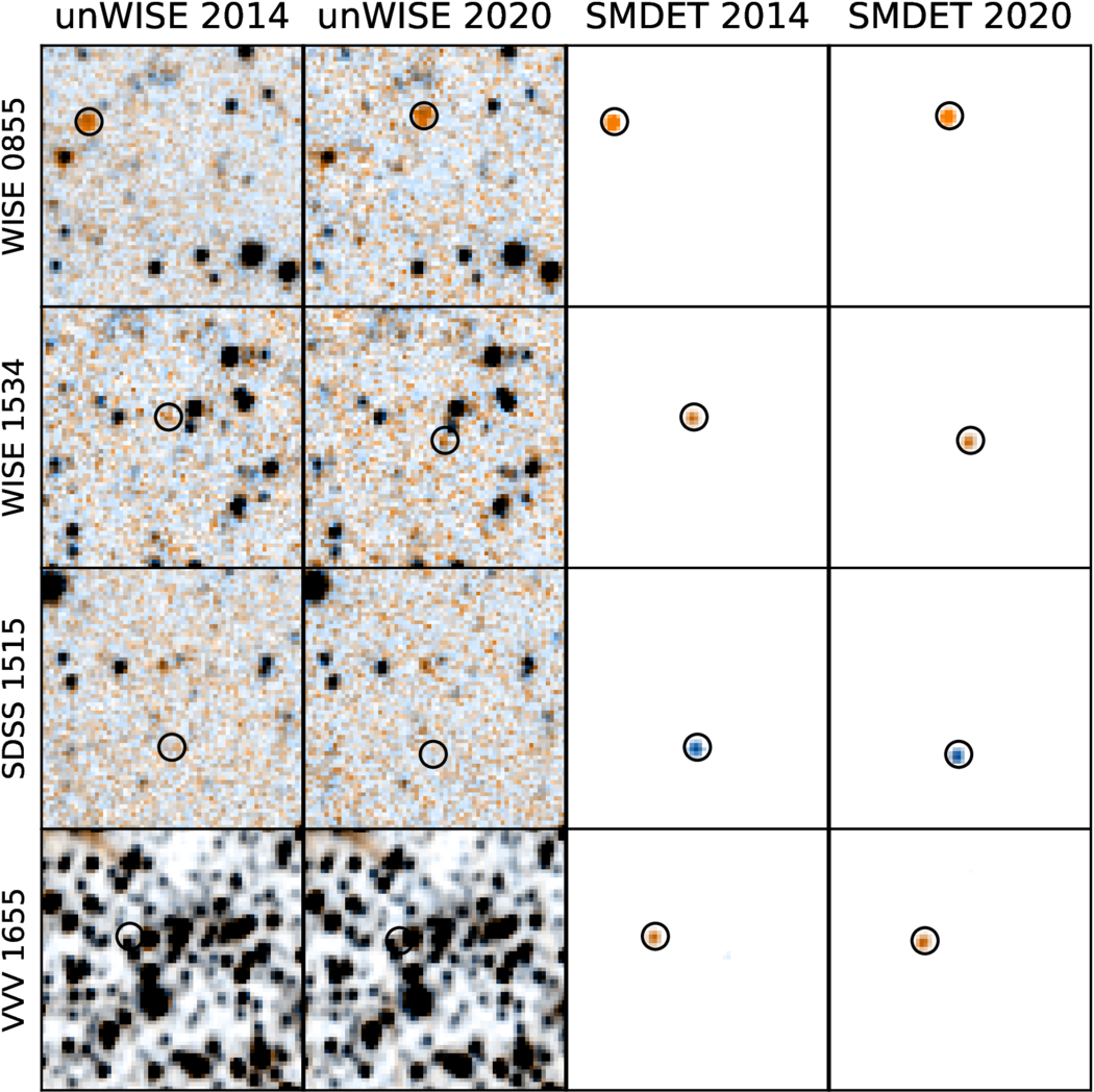 Gallery of first and last images in SMDET input (unWISE image time series) and output (combined with ﹩\sigma ({\hat{y}}_{{\rm{seg}}})\odot {{\rm{SS}}}^{-1}({\hat{y}}_{{\rm{obj}}})﹩). Pixel values clipped below −15 and above 80 DN in input images (except for row VVV 1655) and dynamic range adjusted for output images to aid visibility.