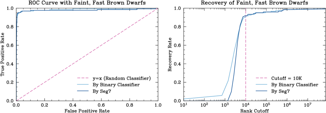 Receiver operating characteristic (ROC) curves (left) and recovery rate (right) comparing two methods of ranking sky regions with SMDET output. True positive classifications are of sky regions containing faint, fast brown dwarfs from our sample. False positive classifications are of sky regions that we rejected in our review (Section 4.1) and sky regions that we did not review. The ROC is marginally underestimated because of the latter. Recovery rate increases after rank 1000 because prior ranks consist of false positives and other true positives, such as brown dwarfs, white dwarfs, and low-mass stars. A vertical line shows our examination limit at rank cutoff = 10 K. The binary classifier is a neural network, and Seg7 is a simple metric (Section 4.2).