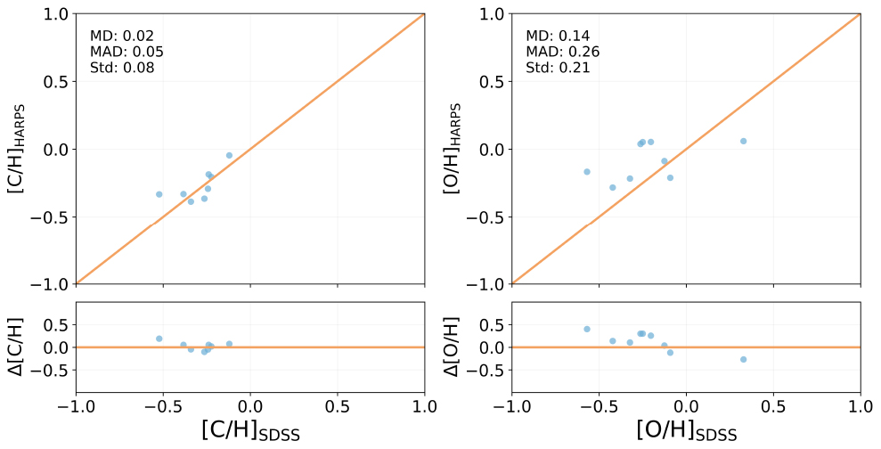 Comparison of stellar abundances between HARPS and SDSS. Top: direct comparison of [C/H] (left) and [O/H] (right). The orange line indicates the 1:1 relation. Bottom: residuals relative to the 1:1 line. Inset statistics denote the MD, median absolute deviation (MAD), and Std.