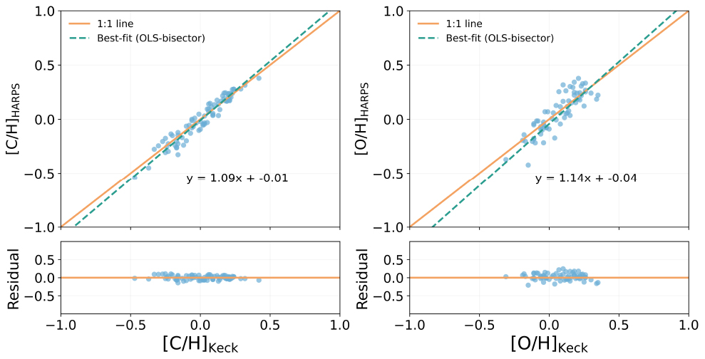 Calibration of abundances from KECK to HARPS. Top: correlations of [C/H] (left) and [O/H] (right). The orange solid line indicates the 1:1 relation, and the teal dashed line shows the best-fit OLS-bisector calibration. Bottom: residuals relative to the best-fit line.