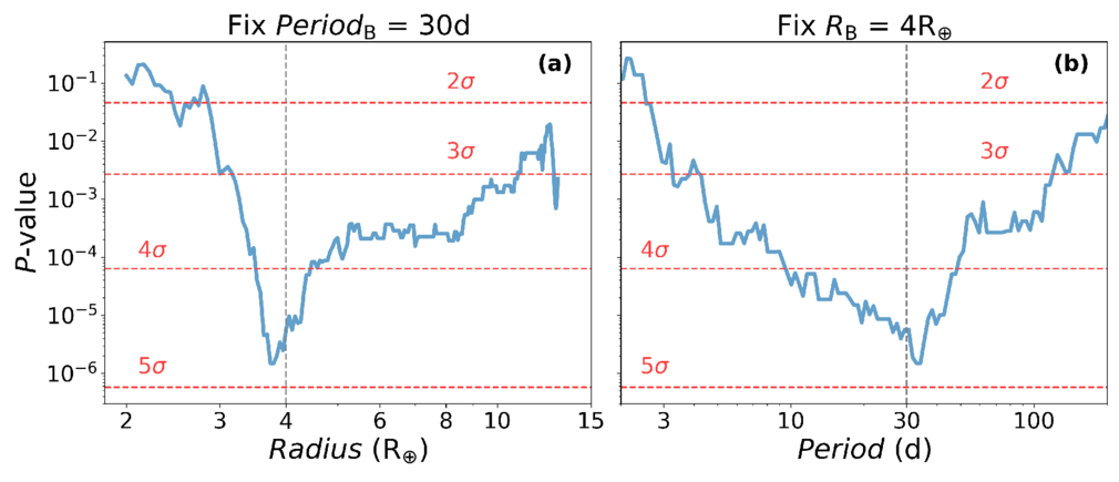 P-values from K-S tests comparing C/O distributions of exoplanet hosts across radius (a) and period (b) selection. This figure shows the P-values from K-S tests, which assess whether the C/O distributions of short-period and long-period exoplanets are drawn from the same parent population. Panel (a) shows the P-value as a function of the chosen radius boundary for selecting giant planets, with the orbital period boundary fixed at 30 days. The vertical dashed line marks the fiducial radius boundary at RB = 4R⊕. Panel (b) shows the P-value as a function of the chosen period boundary for separating short/long-period giant planets, while fixing the radius boundary at RB = 4R⊕. The vertical dashed line marks the fiducial period boundary at 30 days.