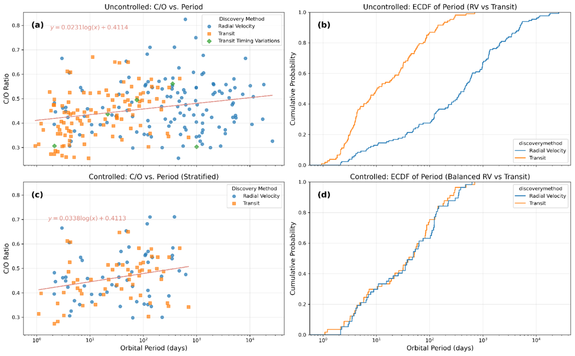 Comparison of C/O–period trends in transit and RV samples: uncontrolled vs. controlled (stratified). Top row: uncontrolled sample of giant planets. (a) C/O ratio vs. orbital period for all discovery methods, with a linear regression fit shown in pink. (b) CDFs of orbital periods for transit and RV planets, highlighting differences in period sampling. Bottom row: controlled sample with stratified period-matched subsampling between RV and transit samples. (c) Regression between C/O ratio and orbital period using the balanced sample. (d) Corresponding CDFs confirm similar period distributions in the controlled case. Regression lines are shown with their equations annotated in pink. All regression fits are performed in log-period space.
