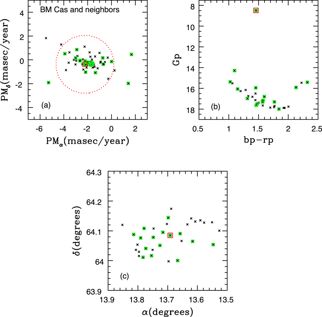 Panel (a): proper motions of stars with G < 18 that have projected offsets ≤0﹩\mathop{.}\limits^{\unicode{x000b0}}﹩085 (∼6 pc) from BM Cas. The black crosses are sources in the 2σ sample, while the green squares mark sources in the 1σ sample. The BM Cas data points are shown as a red square. BM Cas is near the center of the proper motion measurements, indicating that its space motions are typical for this part of the Galaxy. The circle marks the region of this diagram that is used to identify stars that were extracted to construct panels (b) and (c). Panel (b): the CMD of objects that fall within the circle in panel (a). The photometric measurements are from the GAIA DR3 archive. BM Cas is much brighter than other stars in this sample, which is a characteristic that is common to intermediate mass interacting binary systems (T. J. Davidge 2023). There is an absence of bright blue stars that would be indicative of a population of young massive stars, although there are objects with bp − rp > 2 that are probable PMS stars. Panel (c): the projected on-sky distribution of objects with Gp < 18 that have distances and proper motions similar to BM Cas. The closest companion to BM Cas has a projected offset of ∼0.5 pc. The stars that are possible PMS objects in panel (b) are in the lower right-hand corner of this plot, and so have projected offsets of many parsecs from BM Cas.