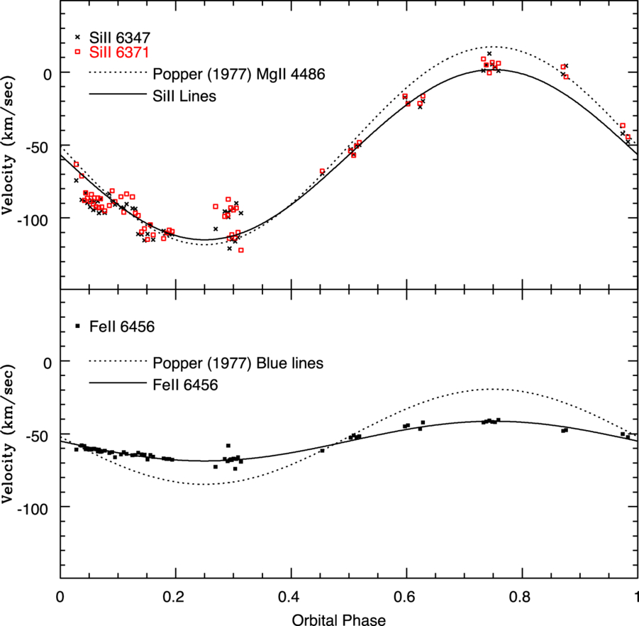 Phased velocity curves obtained from the cores of Si II 6347, Si II 6371, and Fe II 6456. The scatter in the Fe II measurements at a given phase suggests a measurement uncertainty of ±1–2 km s−1, while the scatter among the Si II measurements suggests a ± 5 km s−1 uncertainty. A cycle-to-cycle dispersion in the Si II and Fe II measurements is seen near phase 0.3. The solid lines are fits to the measurements that assume a circular orbit. Velocities from the Si II lines were averaged together to generate the Si II curve. Velocity curves based on measurements made by D. M. Popper (1977) at shorter wavelengths are shown as dotted lines for Mg II 4481 (top panel) and for other lines at blue wavelengths (bottom panel).
