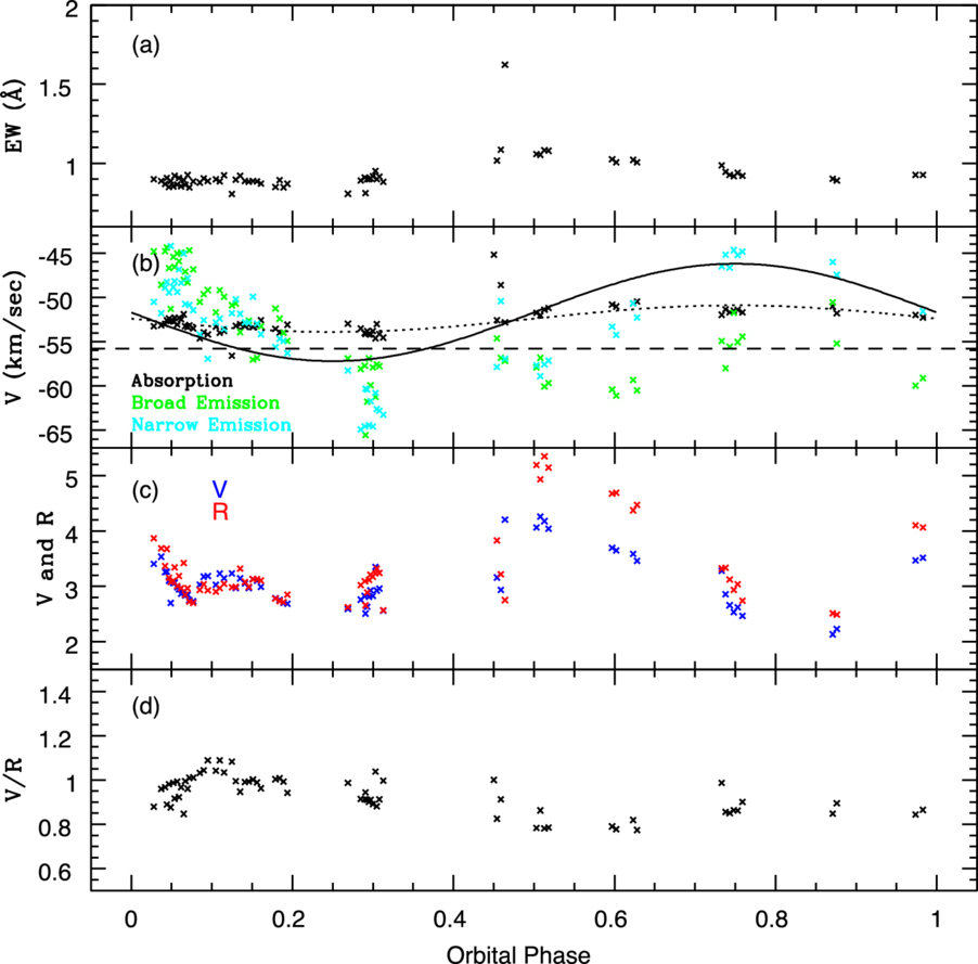 Phase-related characteristics of Hα absorption and emission. Panel (a): the equivalent width of the absorption component. Panel (b): heliocentric velocities of the absorption and emission components. The dashed line is the mean of the γ velocities measured from Si II and Fe II in Table 2, while the dotted line is a fit to the Hα absorption velocities assuming a circular orbit that is in phase with that of the primary. The velocity of Hα absorption varies with orbital phase in approximate sync with the motion of the primary. The solid line is a fit to the narrow emission velocities assuming motion that is synced with the primary. There is substantial scatter about the fit, with a possible phase lag with respect to the motion of the primary. The motion of the broad emission component is clearly out of sync with that of the primary and this is likely due to a kinematically distinct Hα component that appears at some phases (see the text). Panel (c): the heights of the pseudo-peaks that bracket the absorption line, which vary with orbital phase and are strongest between phases 0.45 and 0.65. Panel (d): V/R, which also varies with orbital phase. The variation in V/R is likely due in part to the relative motions of the absorption and emission components.