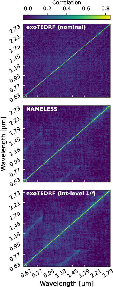 Covariance matrices extracted from the NIRISS/SOSS light curve fit residuals for the nominal exoTEDRF reduction (top), the NAMELESS reduction (middle), and the alternate exoTEDRF reduction performing an integration-level 1/f noise correction (bottom). Significant residual covariance between wavelengths that share a detector column are present when performing the 1/f noise correction at the integration level, but not for the group-level correction.