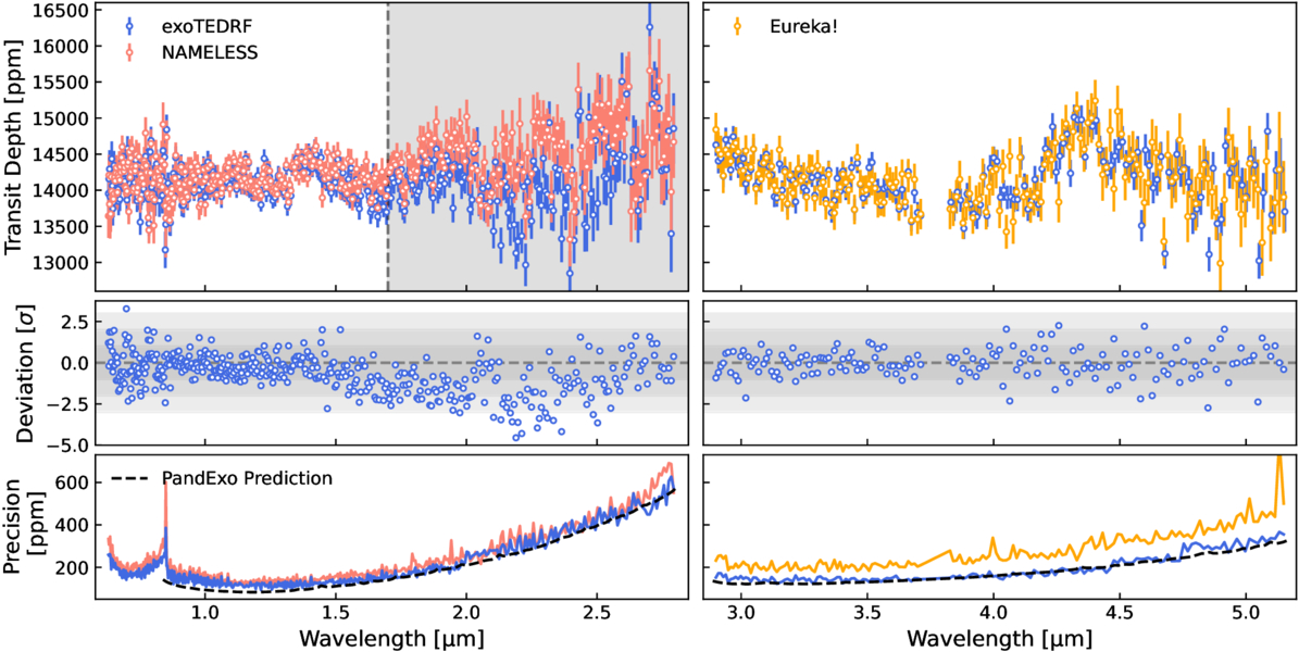 Comparison between our nominal exoTEDRF spectra and alternate reductions with NAMELESS for NIRISS (left panels) and Eureka! for NIRSpec (right panels). Top: the two spectra produced for each instrument overplotted. The gray shading in the NIRISS panel denotes wavelengths not used in the comparative retrievals (see Section 3). Middle: error-normalized differences for each instrument. There is a significant divergence between the two NIRISS/SOSS spectra redwards of ∼1.7 μm, which can be attributed to differences in 1/f noise correction methodologies (see Appendix B). Bottom: light curve scatter as a function of wavelength compared to PandExo predictions.