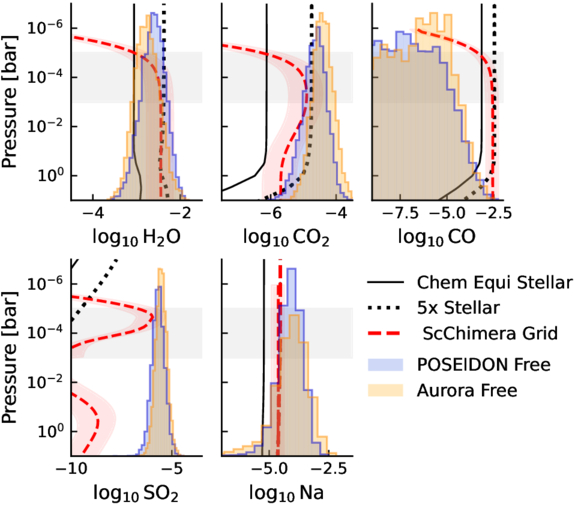 Abundances of several prominent chemical species inferred from the POSEIDON (blue histograms) and Aurora (orange histograms) free retrievals. Overplotted are chemical equilibrium abundance profiles for a stellar (logZ∼2× solar, C/O=0.42; solid) and 5× stellar (logZ∼10× solar; dotted) metallicity atmosphere, as well as constraints from the self-consistent grid (red). The gray shaded regions denote the approximate pressures probed by these observations. Solar abundances are taken to be those from M. Asplund et al. (2009) to match N. K. Nikolov et al. (2022).