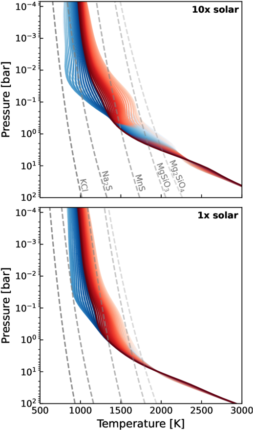 PT profiles derived from cloud-free UM GCM simulations of WASP-96 b at solar (bottom) and 10× solar (top) metallicity, which bracket our derived atmosphere composition. Blue and red profiles represent the morning and evening hemispheres, respectively. Levels of fading denote latitude, with the boldest colors being polar latitudes. Condensation curves for prominent condensate species (labeled) are shown with gray dashed lines.