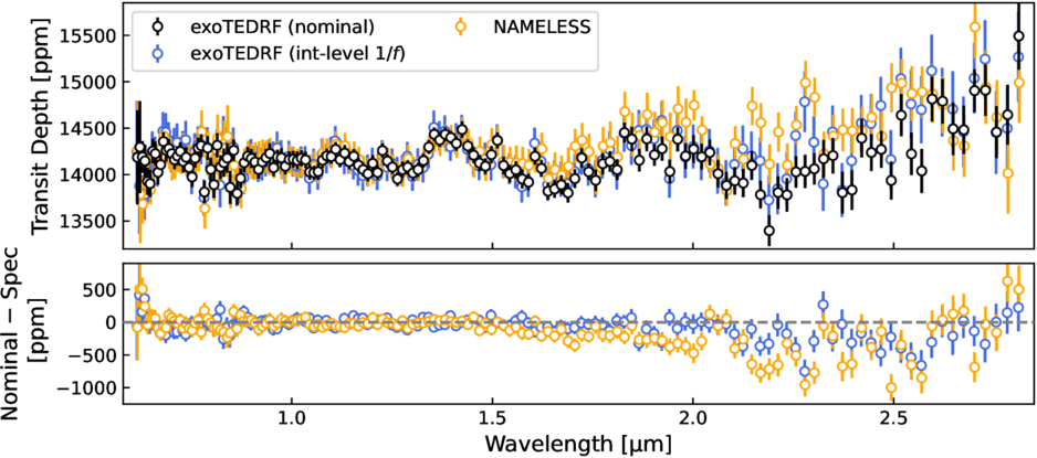 The differences between the exoTEDRF and NAMELESS NIRISS/SOSS spectra redwards of ∼1.75 μm can be attributed to the 1/f noise correction being performed at the integration vs. the group level (i.e., after vs. before ramp fitting). An alternate exoTEDRF reduction skipping the group level 1/f correction and implementing the same step at the integration level reproduces qualitatively the differences with the nominal spectrum seen with NAMELESS.