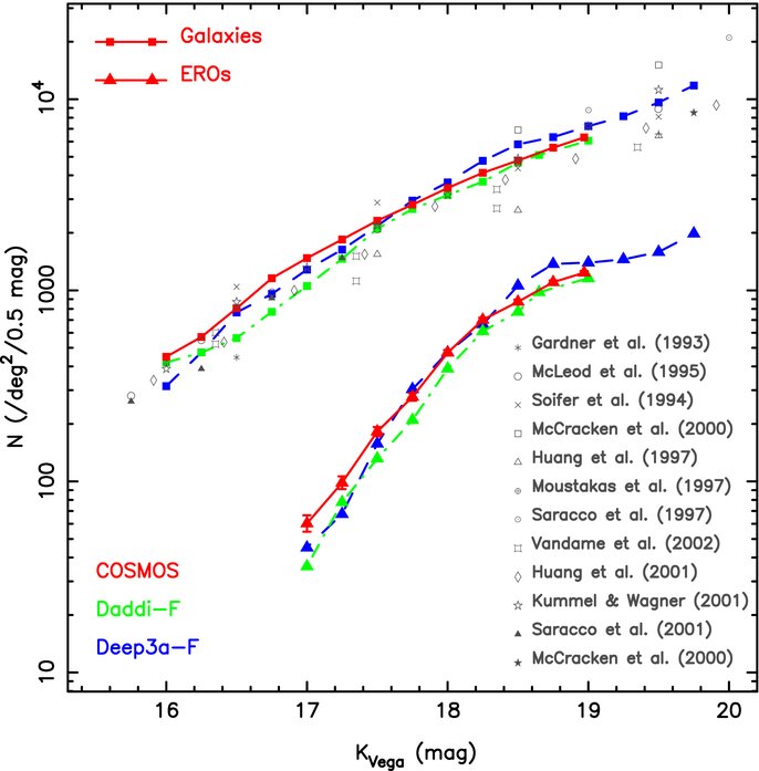 K-band differential number counts for field galaxies and EROs in COSMOS, compared with a compilation of results taken from various sources. The filled squares correspond to field galaxies, and triangles correspond to EROs. Red, green, and blue color correspond to the counts of galaxies and EROs in the COSMOS (this paper), Daddi-F and Deep3a-F (Kong et al. 2006), respectively. The error bars of EROs indicate the Poissonian uncertainties.