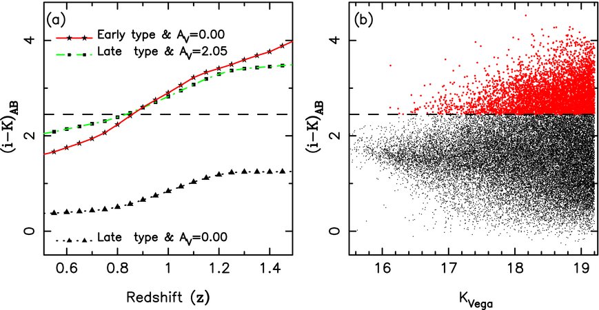 (a) Model i − K color as a function of redshift. Representative model galaxy SEDs are taken from Kodama & Arimoto's (1997; KA97) population synthesis models: a late-type galaxy with A V = 0.0 (triangles), an early-type galaxy with A V = 0.0 (stars), and a late-type galaxy with A V = 2.05 (squares). (b) i − K plotted against K for all galaxies in the K-limited sample. Red circles denote EROs. The horizontal dashed line corresponds to the color threshold ( i − K = 2.45 in AB) for selecting EROs in this paper.