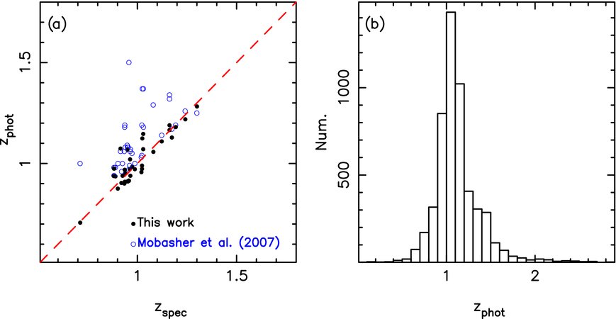 (a) Comparison between photometric and spectroscopic redshifts for a sample of 38 EROs in COSMOS with available spectroscopic redshifts. The filled circles correspond to photometric redshifts from this work, and open circles correspond to photometric redshifts from Mobasher et al. (2007). (b) Photometric redshift distribution of EROs in the COSMOS field.