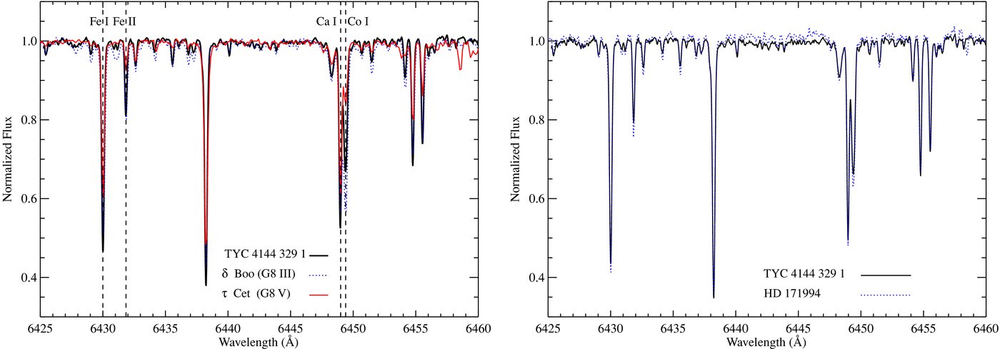 Both panels: comparison of our HIRES spectrum of TYC 4144 329 1 with δ Boo, τ Cet, and HD 171994 (G8 III, G8 V, and G8 IV, respectively). All spectra presented in this figure have been shifted to the Earth rest frame with wavelengths in air. Left panel: luminosity class sensitive features (such as Co i λ6450) indicate that TYC 4144 329 1 has a luminosity class in between that of a giant star and a dwarf star (Strassmeier & Fekel 1990). Right panel: TYC 4144 329 1 with HD 171994 overplotted, both spectra have R~ 40,000. A signal-to-noise ratio (S/N) ~190 HD 171994 spectrum was obtained from the ELODIE archive (Moultaka et al. 2004). We match our HIRES spectrum to the lower resolution pixel sampling of the ELODIE spectrum (pixel widths of ~1.3 km s −1 and ~3.1 km s −1 for HIRES and ELODIE, respectively). HD 171994 is our qualitative best match to TYC 4144 329 1, and hence we adopt its metallicity and absolute visual magnitude (Soubiran et al. 2008) for TYC 4144 329 1. From the adopted absolute visual magnitude, we estimate a distance of ~550 pc to the TYC 4144 329 system.