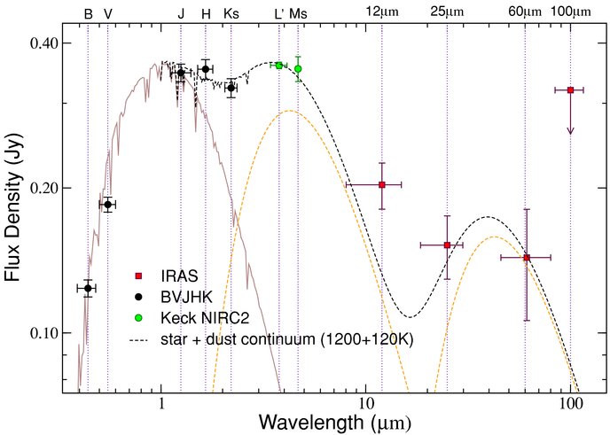 We detect significant infrared excesses from TYC 4144 329 2 at wavelengths greater than ~1 μ m. The solid brown curve that peaks near 1 μ m is a synthetic stellar spectrum (Hauschildt et al. 1999) for a 7000 K effective temperature star reddened by an interstellar extinction model. The orange dashed curves that peak near 4 μ m and 40 μ m represent two dust continuum emission blackbodies fitted to dust temperatures of 1200 and 120 K, respectively. The black dashed line, the sum of the above three curves, is a reasonable fit to most of the data points. The elevated position of the 12 μ m IRAS point suggests either a silicate emission feature or some dust with temperature intermediate between 120 and 1200 K. The total luminosity of the excess, determined by integrating under the data points between 1 μ m and 100 μ m, is ~17% of the luminosity of the star. The BV data points (shortward of 1 μ m) are from the TYCHO-2 catalog, whereas the JHK s data points (longward of 1 μ m) are from the 2MASS database. The green data points at L′ and M s are our own measurements obtained on UT 2007 June 23 with the Keck NIRC2 camera. The L′ flux error bar is smaller than the point size on the plot. The four red data points from 12 to 100 μ m are from the IRAS Faint Source Catalog. The horizontal bars indicate the filter bandwidths.