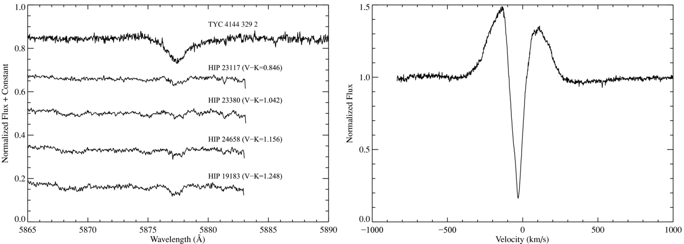 Left panel: Helium λ5877 absorption feature in TYC 4144 329 2 and nondusty main-sequence field F-type stars. These field F-type stars have He i λ5877 EWs of ~40 mÅ, while TYC 4144 329 2 has an He i λ5877 EW of ~290 mÅ. Such an enhanced He i absorption feature could be the result of superheated accreting material (Alencar & Basri 2000). Right panel: Hα complex in TYC 4144 329 2. The broad velocity width of the emission feature is consistent with a star that is accreting gas (White & Basri 2003). The deep central absorption component might in part be due to disk gas orbiting the star. Similar features are seen in the Hβ absorption line and the Na D absorption lines (see Section 3.3). Wavelengths in this figure are plotted in the heliocentric vacuum scale.