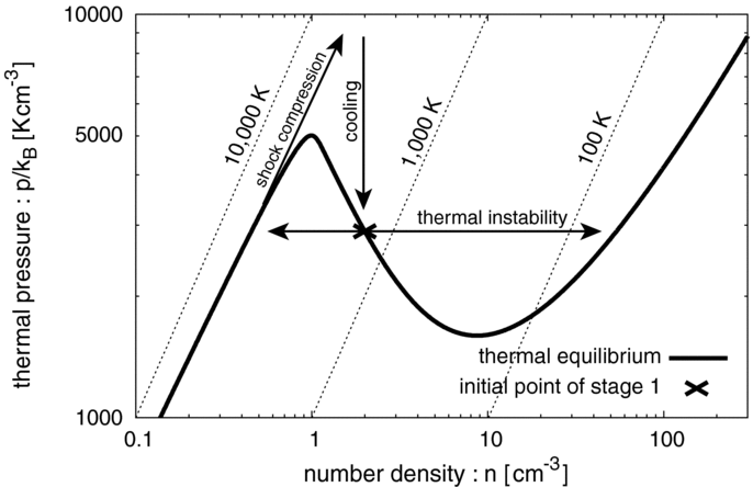 Thermal equilibrium state of the cooling function (thick solid line). The isothermal lines of 10,000 K, 1000 K, and 100 K are plotted as dashed lines. The evolutionary track of diffuse WNM that is compressed by a shock wave and cooled by following radiative cooling to form thermally unstable gas is illustrated as allows. We also illustrate the evolutionary tracks of the thermal instability that are simulated in Stage 1. The initial unperturbed state of Stage 1 is plotted as a cross.