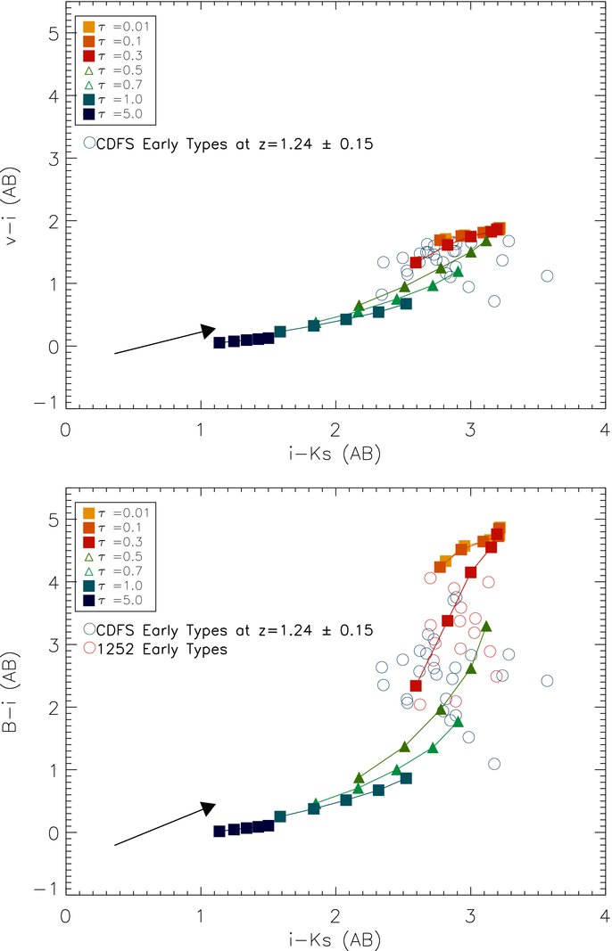 Top panel: i − K s vs. V− i color–color plot of BC03 CSP models at z = 1.24 superimposed on our GOODS ETG photometry at z = 1.24 ± 0.15 in blue circles. The squares account for SFHs with various τ models. The grids are drawn for seven different τ's and five ages (2, 2.5, 3, 3.5, and 4 Gyr): the colored lines represent iso-metallicity colors of Z ☉. The black arrow indicates an extinction of E( B − V) = 0.2 as parameterized with the reddening curve of (Cardelli et al. 1989). Bottom left panel: i − K s vs. B− i color–color diagram of the same models and data: B band (λ rest ~ 2000 Å) is mandatory to break the age–SFH degeneracy at z = 1.24.