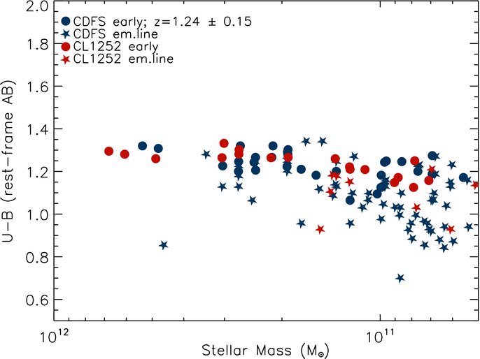 U− B color–mass diagram of the mass-selected samples of CL1252 early- (filled red circles) and late-type (red stars) galaxies as well as of CDFS field early- (filled blue circles) and late-type (blue stars) galaxies. Uncertainties in the stellar mass are ~0.15 dex. Field ETG galaxies are distributed around the cluster red-sequence, although with a larger scatter.