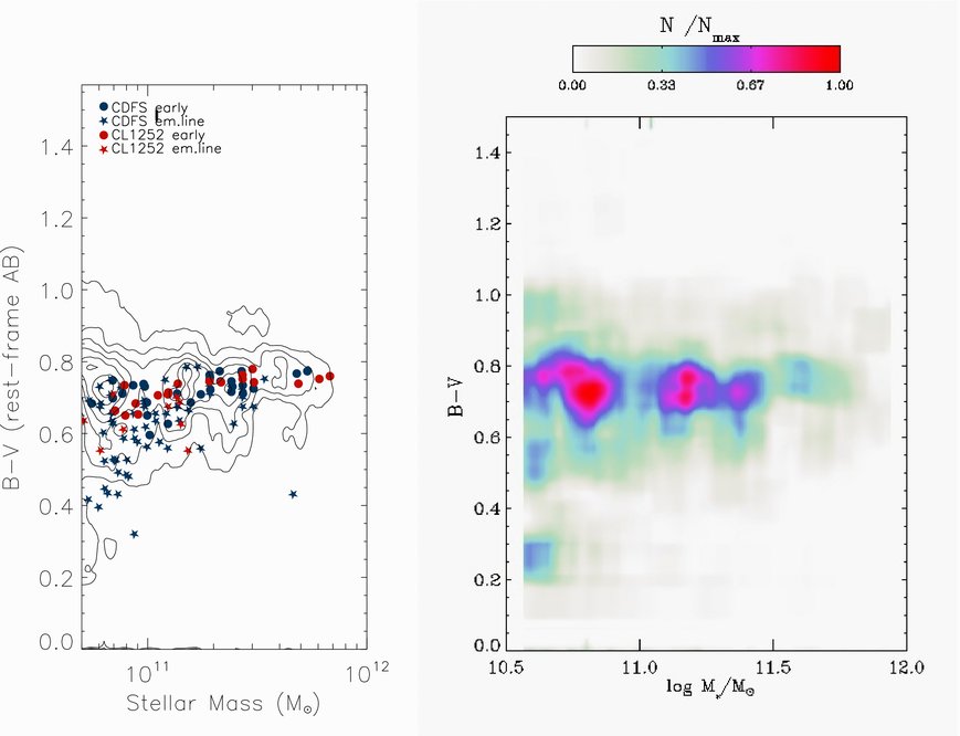 V color vs. stellar mass diagram of the observed samples of cluster and field galaxies (left panel: symbols are the same as