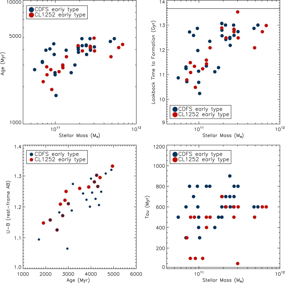 Top left panel: stellar mass vs. star-formation-weighted ages for the ETG in the cluster (filled red circles) and in the field (filled blue circles). Top right panel: the dependence of the look-back time to form on the galaxy mass. Bottom left panel: rest-frame U− B color vs. age of ETG in both environments. Bottom right panel: formation timescales, τ, of ETG as a function of their stellar mass in both the field and cluster environment. The mean error in stellar age is 0.5 Gyr. Uncertainties in stellar masses and τ are ~0.15 dex and ~0.2 Gyr, respectively.