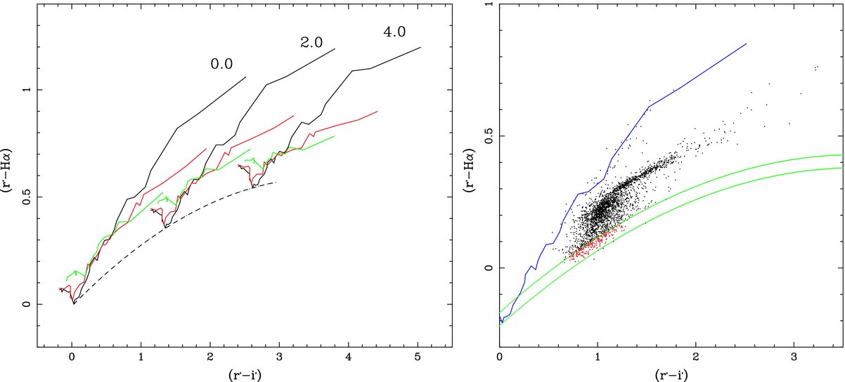 Left-hand panel: synthetic ( r′ − H α) vs. ( r′ − i′) colors of normal stars under the effect of interstellar extinction (adapted from Drew et al. 2005). For a given visual color excess E( B − V), the black lines represent the MS, the red lines represent the giant sequence and the green lines show the positions of the supergiants. The dashed line shows the reddening track for the normal metallicity A0V star from the Pickles (1998) library: it is a representative early-A reddening line. Right-hand panel: the ( r′ − H α) vs. ( r′ − i′) color plane for IPHAS field 4232. An early-A star strip, of width 0.05 mags in ( r′-H α) (green lines) was used to select for A-type dwarfs (red dots). The blue line corresponds to an unreddened MS track.