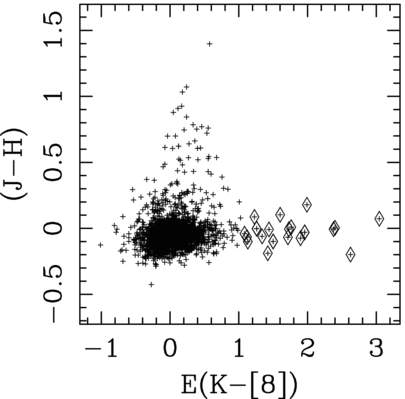 Dereddened ( J − H) − ( K − 8) color–color diagram for the 2692 A-type stars in the GLIPHAS sample. The 20 objects having a ( K − 8) color excess with S/N >3 are highlighted with diamond symbols.