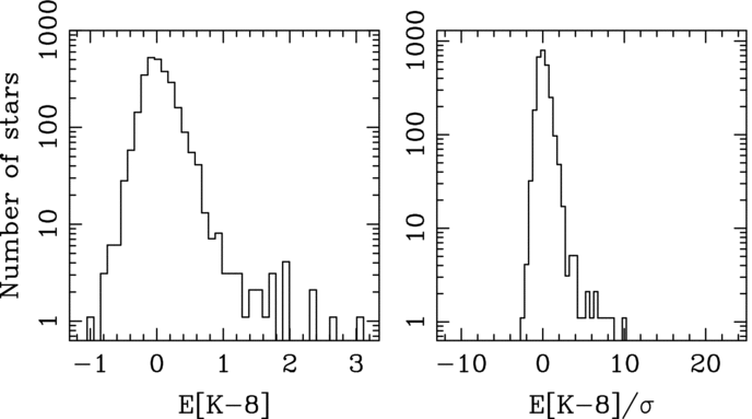 Left-hand panel: distributions of E( K − 8) color excesses for 2692 A-type stars in the GLIPHAS sample. Right-hand panel: distributions of S/N for ( K − 8) color excesses.