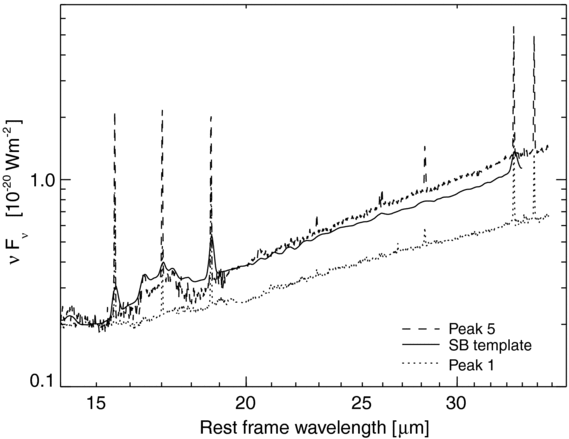 Comparison of the 14–37 μm continuum slopes for three selected objects: peaks 1 and 5 with the most shallow and steep slopes in our sample of Antennae clusters, and the average starburst template spectrum from Brandl et al. (2006). The spectra are plotted in units of ν F ν to enhance the differences, and have been normalized to unity at 15 μm.