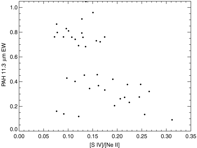 Relative strength of the 11.3 μm PAH feature (a normalized "line"-to-continuum ratio) vs. the hardness of the radiation field as expressed by the line ratio of [S iv]/[Ne ii]. Each data point corresponds to one pixel in the spectral map. Only those 42 pixels with a signal of greater than four standard deviations in the S iv map have been included.