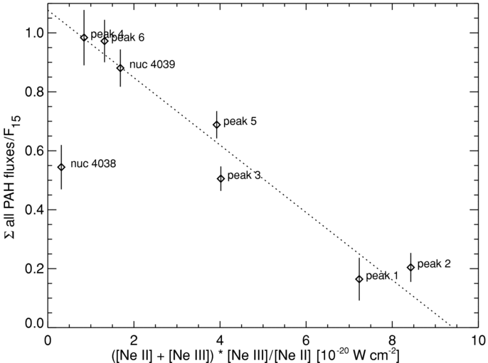 Relative strength of all PAH features within the 10–20 μm range vs. the strength of the radiation field.