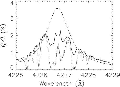 Role of k G,λ(μ). The solid line is the model profile computed using pure R II- AD type redistribution and k G,λ(μ) determined from observations. The dotted line is the observed Q/ I in the nonmagnetic region (same as the solid line in the top panel of Figure 2). The dashed line is the model profile computed using pure R II- AD type redistribution but with a flat k G,λ(μ) = 0.112 for all wavelengths. The free parameters obtained from the model fit are S = 0.325, C = 9.7 × 10 −5, and P c = 0.25%.