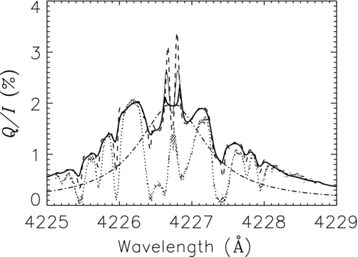 Role of PRD. The heavy solid and dotted lines are the same as in Figure 4. The dashed line is the model profile computed with frequency coherent scattering (CS), while the dot-dashed line is computed assuming CRD. The thin solid line is the model profile with R II- AA , while the heavy solid line has been computed with R II- AD .