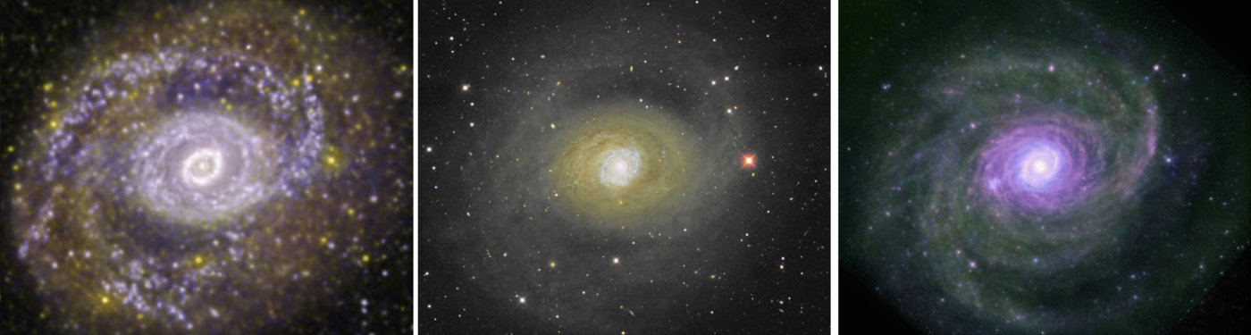 Panel showing M94 (NGC4736) galaxy through the ultraviolet, optical, and infrared wavelengths. Left panel shows M94 as viewed by the GALEX bands (blue: FUV; yellow: NUV). Middle panel shows M94 as viewed by the SDSS bands (blue: g band; green: r band; red: i band). Right panel shows M94 as viewed by the Spitzer bands (blue: 3.6 μm; green: 8 μm; red: 24 μm). In all the cases, north is up and east is left. The area shown (18′ × 15′) is selected for being the common area covered by the set of facilities used in this work.