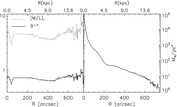 Left panel: ( g − r) color and ( M/ L) r profiles of M94. Right panel: stellar mass density profile of M94 (NGC4736) obtained using the r-band profile and ( M/ L) r from the ( g − r) color following the prescription given by Bell et al. (2003).