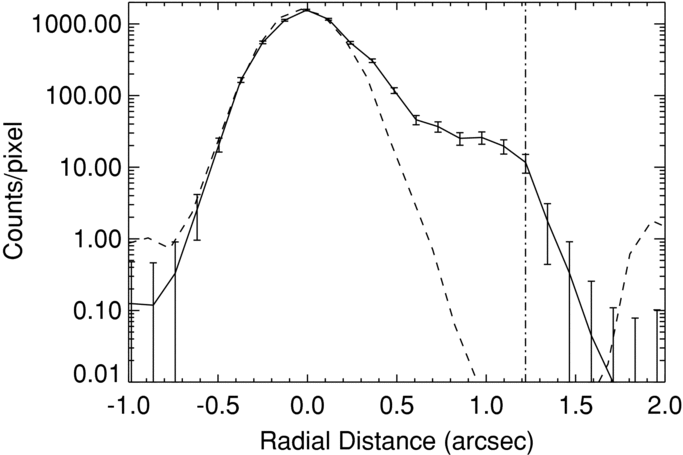 125 spatial bin (marked with a dot-dashed vertical line), is 1.2 ± 0.3 arcsec. Error bars represent 1 standard deviation.