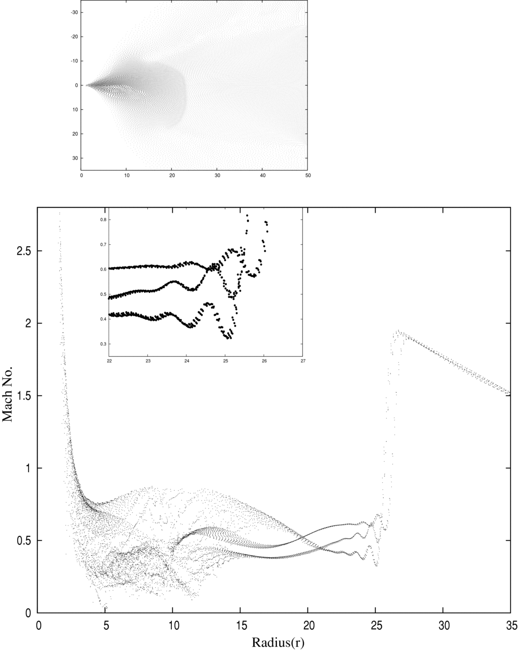 Example of SPH simulation contains shock in the meridional plane (upper panel) and in the lower panel oscillations of that post-shock matter, just after the "shock transition" before it settles down in the subsonic branch.