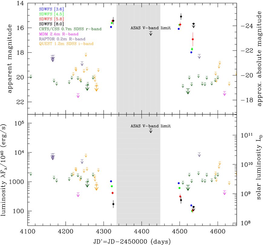 −20 mag at 3.6 μm. The gray area marks the region when the mid-IR transient was not visible to airmass <1.5. The large dark