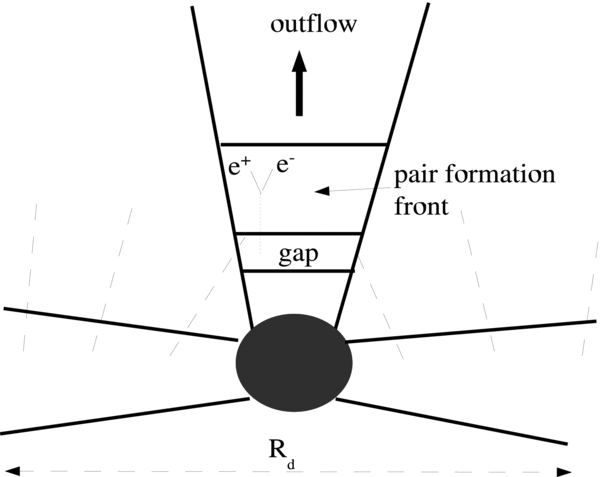 Schematic representation of the magnetosphere structure: a vacuum gap of height h < r s accelerates particles (electrons or positrons) to high Lorentz factors. The gap is exposed to soft radiation emitted from a source of size R d . Curvature emission and inverse Compton scattering of ambient radiation produce VHE photons with a spectrum extending up to 10 4 TeV. Photons having energies below a few TeV can escape freely to infinity. Interactions of IC photons having energies well above 10 TeV with the ambient radiation initiate pair cascades just above the gap, leading to a large multiplicity. A force-free outflow is established just above the pair formation front and appears as the VLBA jet. Intermittencies of the cascade process, induced by modest changes in accretion rate, give rise to the variability of the TeV emission observed by H.E.S.S., and the fluctuations of the resulted force-free outflow, as indicated by the morphological changes of the VLBA jet.