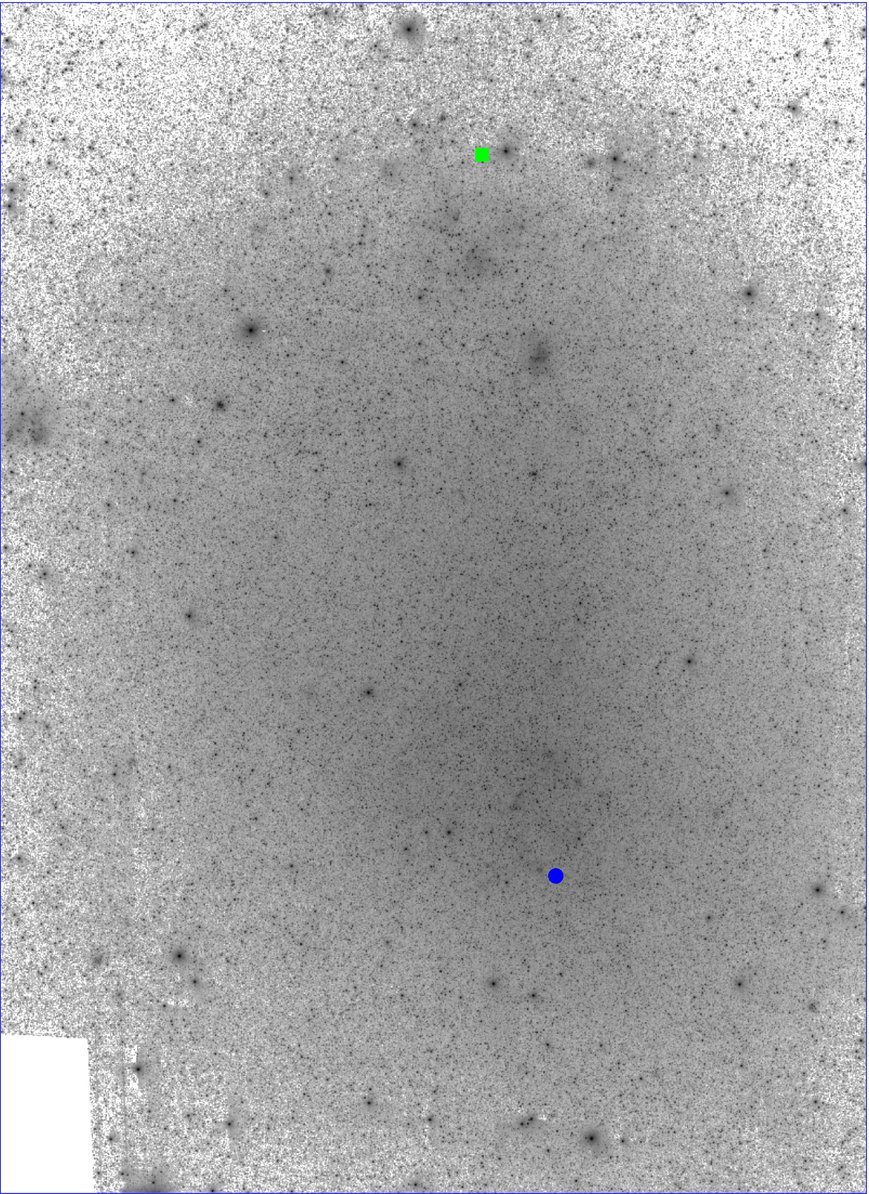 from northeast to southwest on the sky (top to bottom). The blue dot shows the position of the 21 μm object J004441. The green