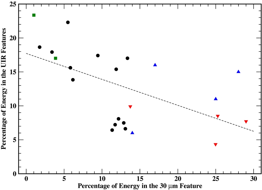 Percentage of the infrared emission in the 30 μm feature is plotted against the percentage of the infrared emission in the UIR features. Different sets of objects are plotted with different symbols: LMC objects (circles), SMC objects (squares), Galactic 21 μm objects re-fit the same way as the Magellanic Cloud objects (down triangles), and Galactic 21 μm objects with fits based on ISO spectra (from Hrivnak et al. 2000; up triangles). The dashed line shows the derived (weak) correlation function.