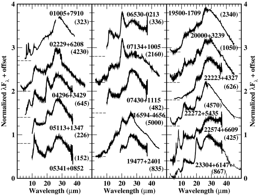 Plot of the normalized Spitzer IRS spectra or Infrared Space Observatory Short Wavelength Spectrometer/Long Wavelength Spectrometer (LWS) spectra for the Galactic 21 μm sources, along with the carbon-rich PPN IRAS 01005+7910 which lacks the feature but which is included for comparison with the LMC object J051228. As in Figure 1 the peak λ F λ values in units of 10 −14 W m −2 are given in parentheses on the right within each panel. The spectra are generally from Hrivnak et al. (2000), Volk et al. (2002), and Hrivnak et al. (2009). The exceptions are the IRS spectrum of IRAS 01005+7910, from Cerrigone et al. (2009), plus the IRS spectra of IRAS 04296−3429 and 22223+4327 which were reduced from the Spitzer archive ( Spitzer program 00045, PI: T. Roellig). For IRAS 22574+6609 and IRAS 23304+6147, the ISO SWS/LWS spectra are shown for wavelengths not covered by the Spitzer IRS spectrum.
